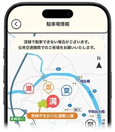 キャンプ地周辺の駐車場空車情報をリアルタイムで配信!週末、車でお越しの方には必須のコンテンツです。