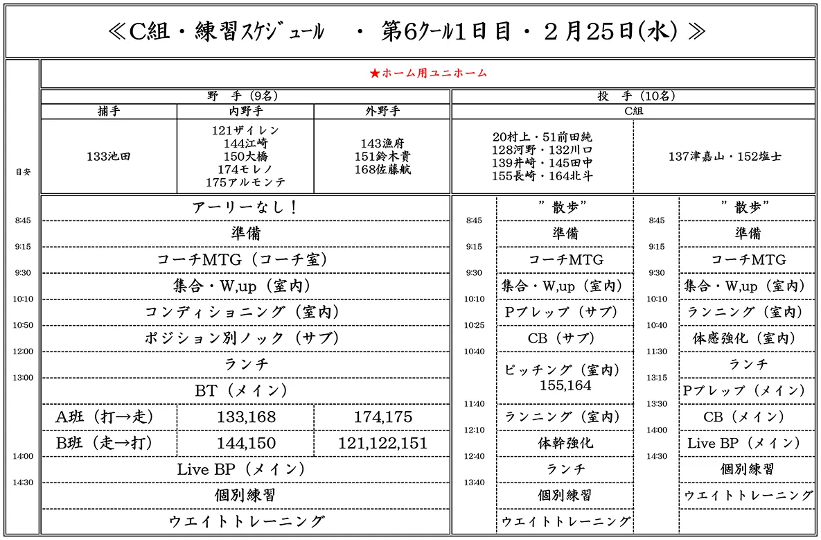 ※ 天候・練習メニューの消化状況などの状況により、日程時間・場所が変更になる場合があります。時間は目安としてください。