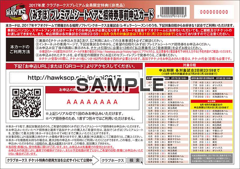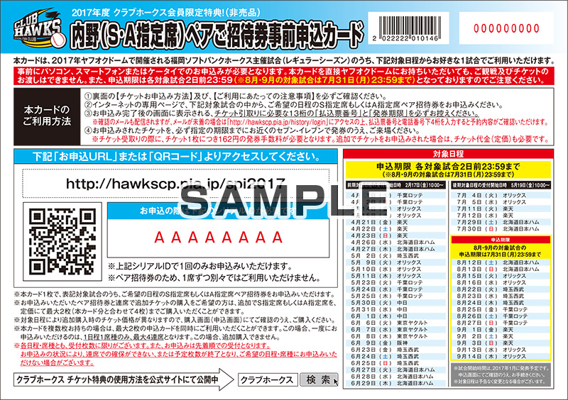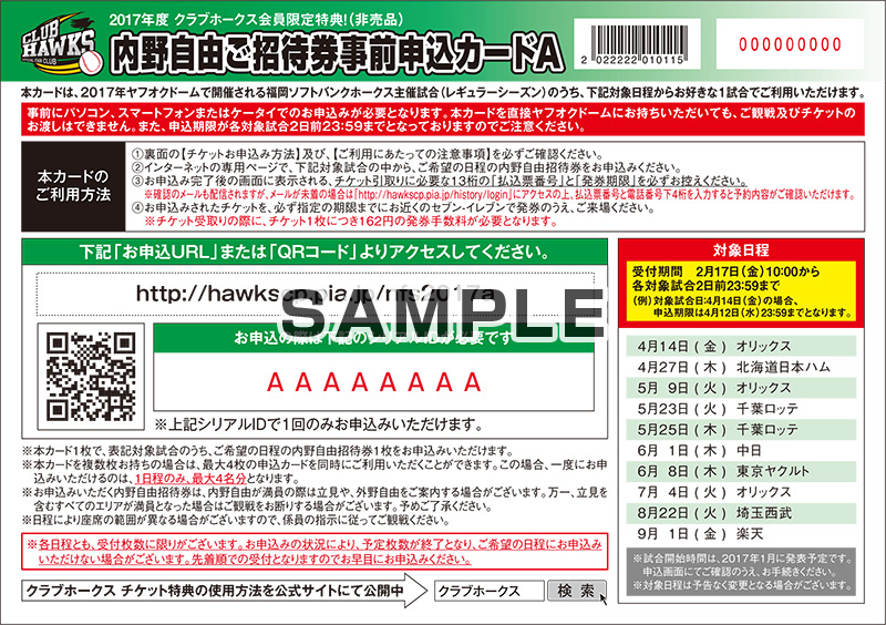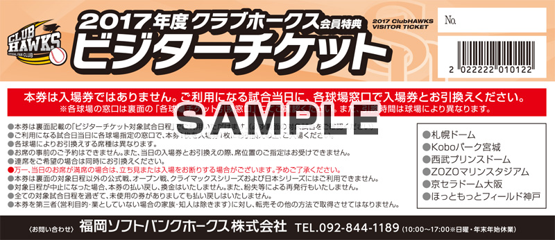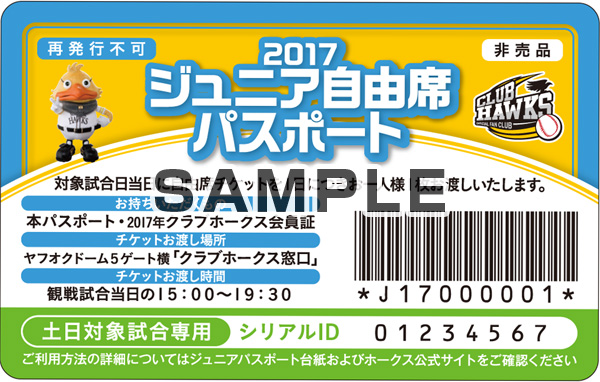 | 申込み方法 | 対象試合当日に、ヤフオクドーム5ゲート横「クラブホークス窓口」にて、本パスポートと会員証をご提示いただくとチケットを1枚お渡しします。 |
