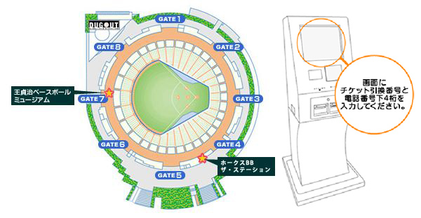 ※野球開催時はヤフオクドーム5ゲート横「5番窓口」でもお引換え可能です。