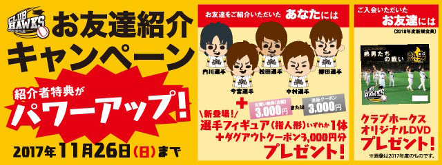 お友達をご紹介いただいたクラブホークス会員様に、選手フィギュア(指人形)1体とダグアウトクーポン3,000円分をプレゼントする、お友達紹介キャンペーンを好評実施中!