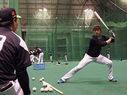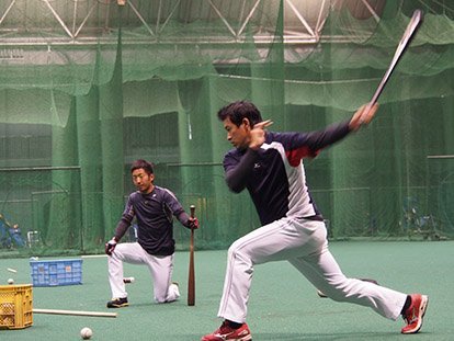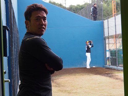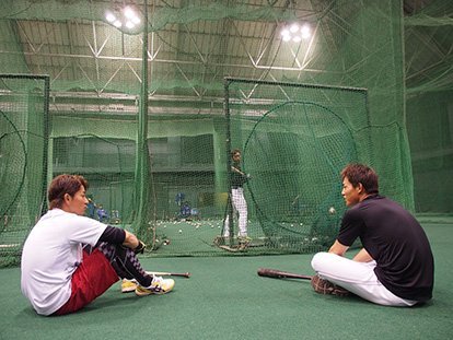 野手陣もそれぞれに個人練習を行いますが、バッティングがほとんど。コーチと一緒にやっている選手、機械相手にやっている選手、先輩の手を借りながらやっている選手、様々です。