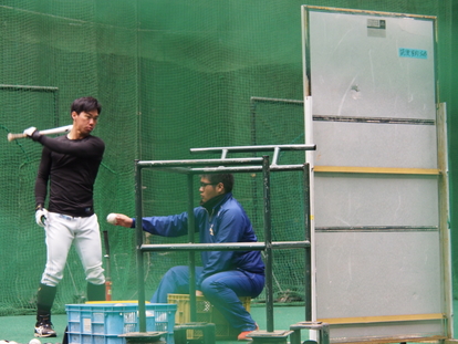 室内練習場では鏡を見ながらいろいろ確認しつつバッティングをしていた長谷川選手。