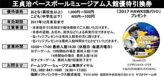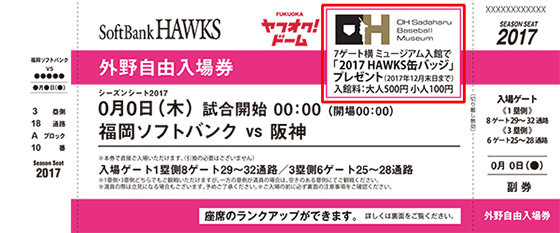 シーズンシートのチケットをお持ちで、王貞治ベースボールミュージアム入館の方に『2017HAWKS缶バッジ』をプレゼントします!