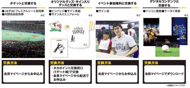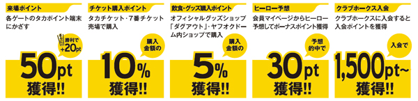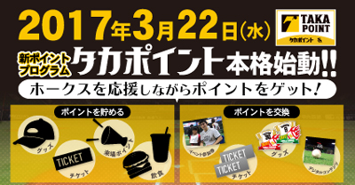 ヤフオクドーム試合開催時の来場をはじめ、飲食・グッズ購入など各種ポイントの加算、タカポイント限定グッズとのポイント交換など、さまざまなサービスが開始いたします。