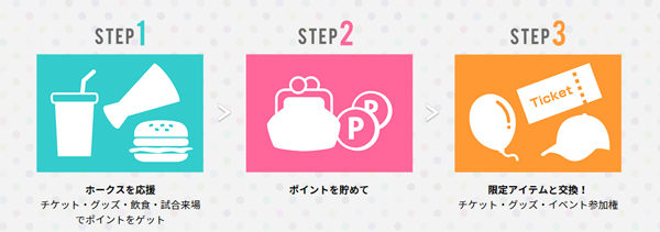 ヤフオクドームの来場はもちろん、チケット、グッズ、飲食の購入などでもポイントを獲得することができます。そして、貯めたポイントはファンにとってうれしい特典と交換可能です。