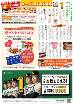 | 配布地域 | 福岡市、糸島市内の全戸 ※一部配布されない地域があります。 また、『ホークスだより』の郵送対応は行っておりませんので、あらかじめご了承ください。 |