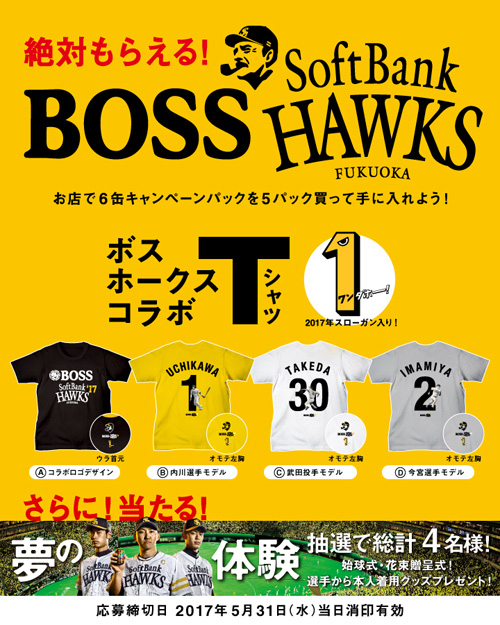 九州地方(沖縄県を除く)のスーパー及び量販店でサントリーコーヒーボス6缶パックを購入し、対象製品に印字された応募券を5枚集めて貼付けて応募すると「ボス・ホークスコラボTシャツ’17」をもれなくプレゼント!