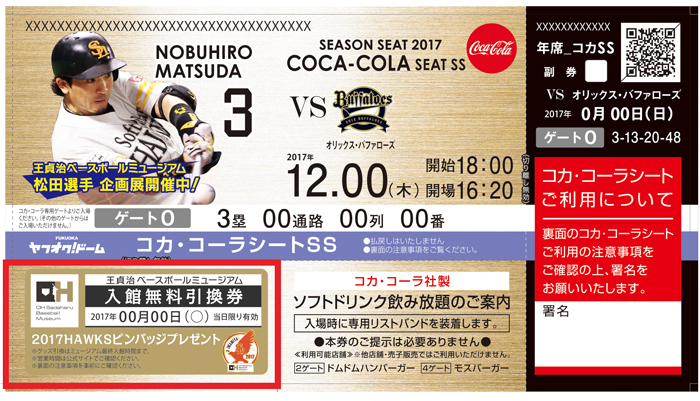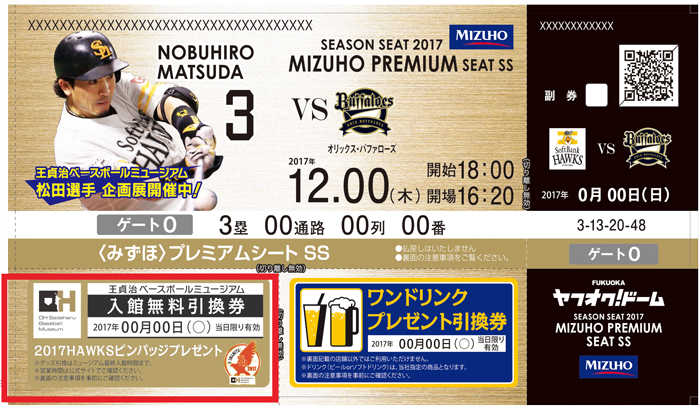 2017年3月31日(金)開幕戦より、上記の<みずほ>プレミアムシート、コカ・コーラシート 年間指定席のチケットをお持ちで王貞治ベースボールミュージアムへご入館の方に『2017HAWKSピンバッジ』をプレゼントします!