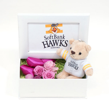 お気に入りの写真も飾ることができるフラワーギフト。ホークスのユニフォームをみにまとったかわいいベアが入っているフラワーアレンジメントです。