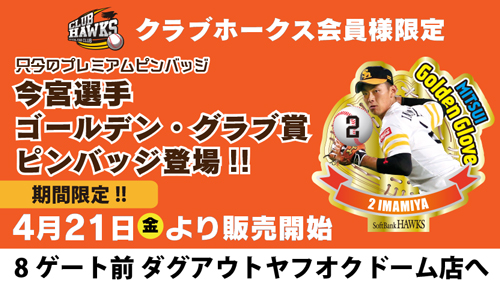 クラブホークス会員様限定ピンバッジガチャコーナーでは、4月21日(金)より、「今宮選手2016パ・リーグゴールデングラブ賞記念ピンバッジ」が登場!