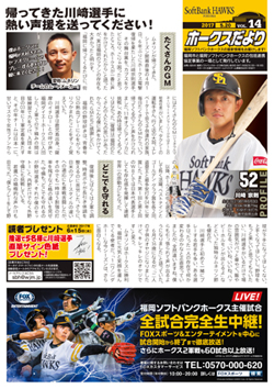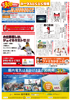 | 配布地域 | 福岡市、糸島市内の全戸 ※一部配布されない地域があります。また、『ホークスだより』の郵送対応は行っておりませんので、あらかじめご了承ください。 |