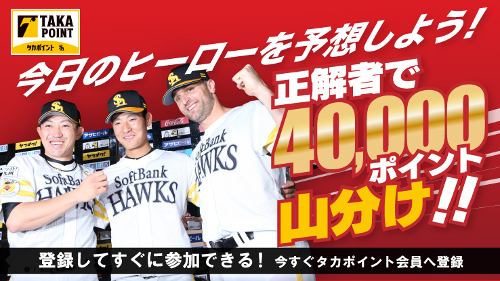 「ヒーロー予想」とは、試合でヒーローになり、お立ち台に上がる選手を予想して見事正解すると、チケットや豪華景品に交換可能なタカポイントがもらえるクラブホークス会員・タカポイント会員(無料)が参加できるサービスです。