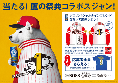 自動販売機でサントリーコーヒーボス スペシャルナインブレンドを買って、ホークス選手直筆サイン入り鷹の祭典コラボスジャンを当てよう!!さらに、応募者全員に『SPECIAL NINE BLEND Tシャツ』をプレゼント!