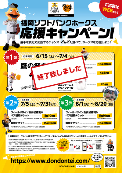どんどん亭全45店舗で、ホークス応援キャンペーンを実施しています。第二弾は7月31日(月)まで。フィールドサイン会参加権利他豪華景品をプレゼントします。