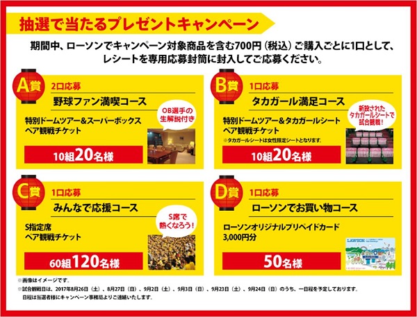 ※試合観戦日は、2017年8月26日(土)、8月27日(日)、9月2日(土)、9月3日(日)、9月23日(土・祝)、9月24日(日)のうち、一日程を予定しております。試合観戦日は、当選者様にキャンペーン事務局よりご連絡いたします。日程はお選びいただけません。