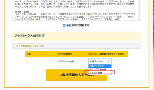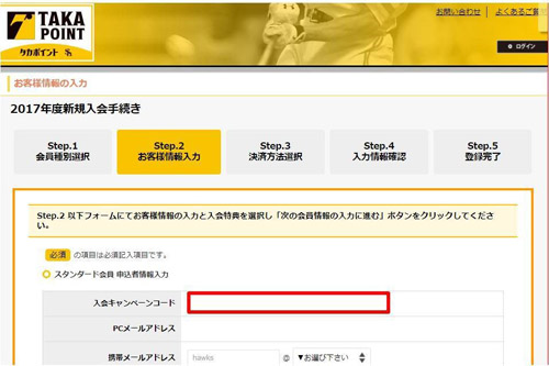 ※入会キャンペーンコードの入力がない場合、年会費の割引や鷹の祭典2017レプリカユニフォームのプレゼントが適用されませんのでご注意ください。