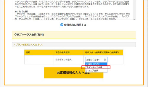 会員マイページの会員種別変更「継続入会・会員種別変更後の会員種別」で「スタンダード会員」を選択してください。選択したら、「お客様情報の入力へ進む」をクリック。