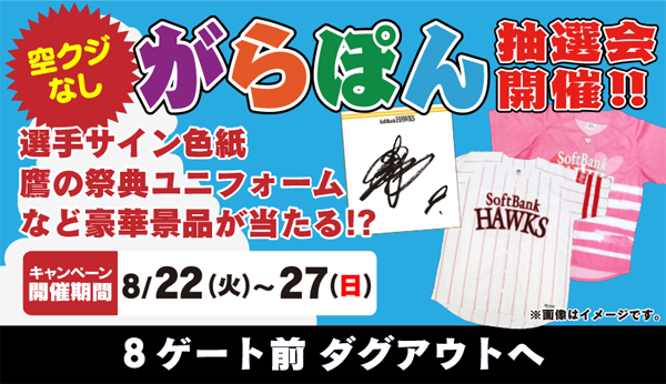 今年配布されたタカガールユニフォームや、鷹の祭典レプリカユニフォームなどが当たるはずれなしの大人気がらぽん抽選会を実施!ドーム内飲食店舗やダグアウトで500円お買い上げ毎にお渡しする抽選会補助券を10点集めて8ゲート前ダグアウトまで♪