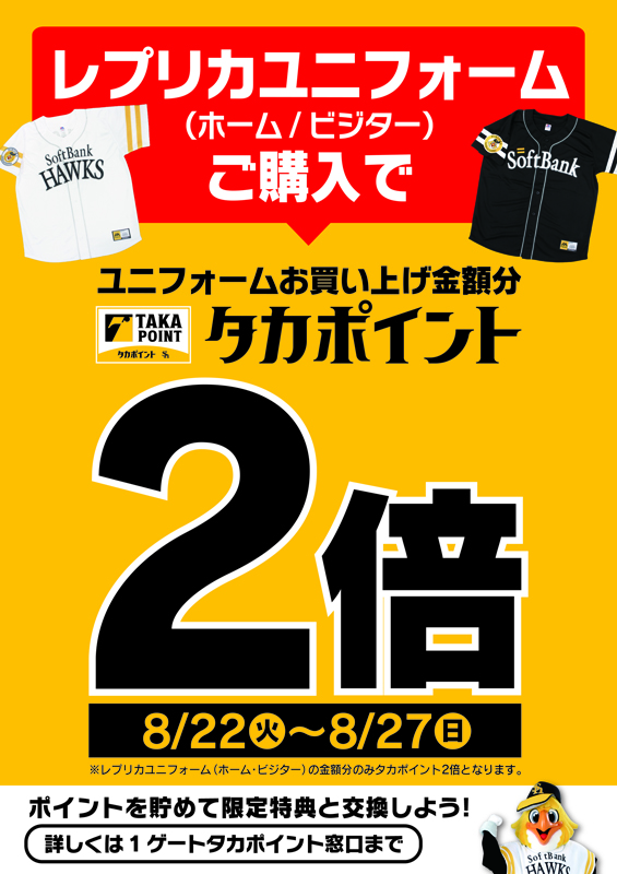 | キャンペーン概要 | レプリカユニフォームご購入で、タカポイントが通常、購入金額の5%付与のところ、2倍の10%付与。 |