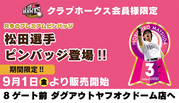 9月1日(金)より、クラブホークス会員限定ピンバッジガチャコーナーに、「松田選手プレミアムピンバッジ」が登場!松田選手のピンバッジを身に着けて、熱い声援を松田選手に送ろう♪