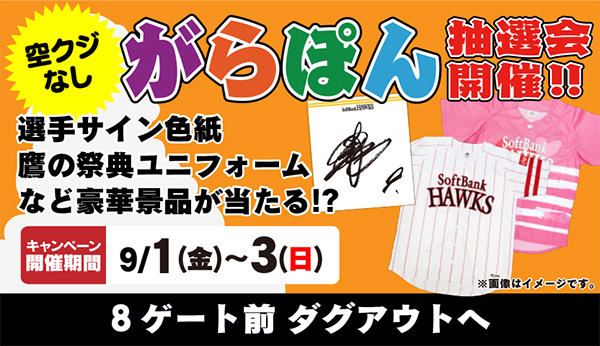 今年配布されたタカガールユニフォームや、鷹の祭典レプリカユニフォームなどが当たる、はずれなしのがらぽん抽選会を実施!ドーム内飲食店舗やダグアウトで500円お買い上げ毎にお渡しする抽選会補助券を10枚集めて、8ゲート前ダグアウトまで♪