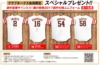 「選手直筆サイン入り!鷹の祭典2017選手仕様ユニフォーム」を計4名様にプレゼントします♪