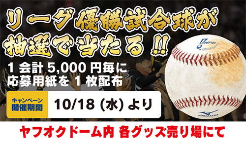 | キャンペーン概要 | 1会計5,000円毎に、リーグ優勝当日の「日付刻印入り使用済試合球」が当たる、応募用紙を1枚プレゼント |