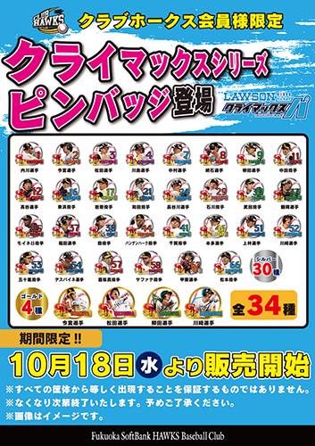 クラブホークス会員限定ピンバッジガチャコーナーにクライマックスシリーズ限定ピンバッジが10月18日(水)から登場!全30選手・34種類!今しか手に入らない限定ピンバッジですので、ぜひコンプリートめざしてダグアウトのピンバッジガチャコーナーまで♪