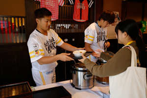 ヤフオクドーム5ゲートにある「おふぃしゃる居酒屋 鷹正」。ファンフェスティバル当日は、「選手サロンカレー専門店 鷹正」として1日限定営業!シーズン中は選手サロンで選手が食べているカレーをファンフェスティバル限定でご提供します。この選手サロンカレーとファンフェスティバル入場券がセットになったお得なチケット。しかも、このカレーはなんと選手がお皿についでくれます!