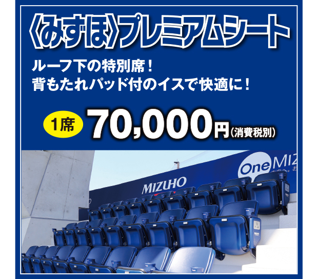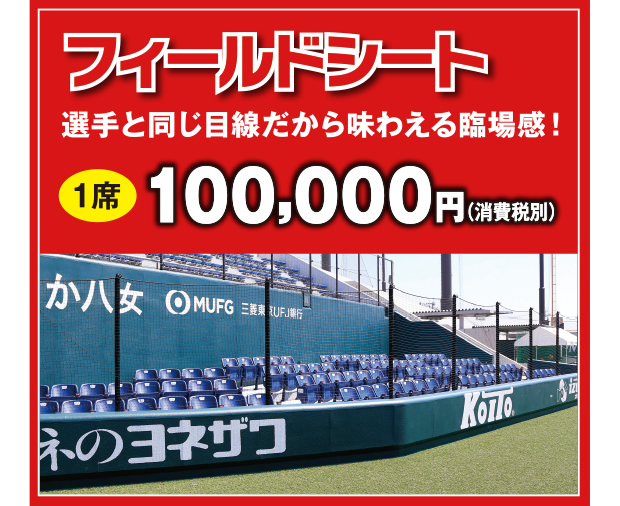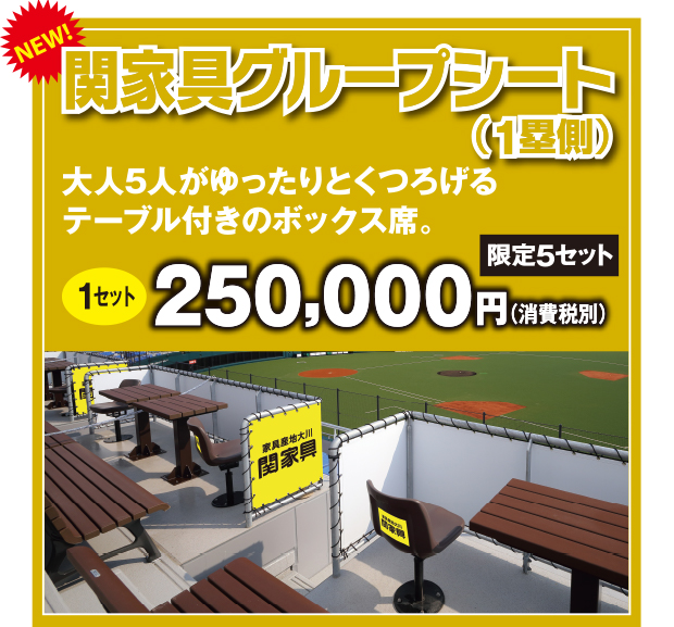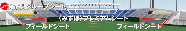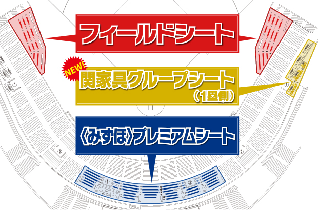 3シーズン目を迎える2018年シーズンでは、大人5名が観戦できる「関家具グループシート」が仲間入りし、「フィールドシート」・「<みずほ>プレミアムシート」と人気の3種類よりお客様の観戦スタイルに合わせお選びいただけます。