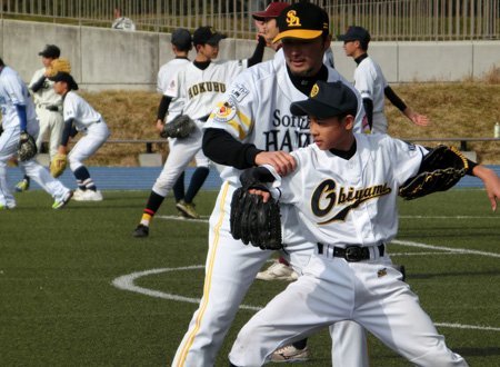 今宮選手はデモンストレーションでバットを握り、柵越えの当たりを披露。「ロングティーの時は、打球を上げるイメージで。だけど力まないように」と丁寧に指導をしていました。和田投手は「このような機会を与えていただいたことを感謝しています。昨年も来ましたが、子どもたちは目をキラキラ輝かせて元気いっぱいでした。まだ大変な思いをしている家庭もあると思いますし、復興はまだ道半ばだと思いますが、子どもたちの元気に僕らも勇気をもらいました」と野球教室を振り返りました。また、懐かしい顔ぶれが一堂に介したこともあって、それも嬉しかった様子。「スギ(杉内投手)は同級生の中でも特に高めあえる存在だし、ユニフォームを着ている(斉藤)和巳さんと接するのも久しぶりでしたからね」とニコニコ顔でした。