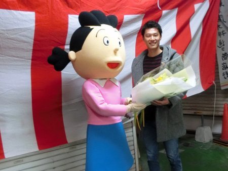 また、パレードの前には西新商店街の「勝鷹水神」では参拝、「二年連続最優秀中継ぎ&日本一」と力強く書き込んだ絵馬の奉納も行いました。そして国民的人気マンガ主人公の「サザエさん」も祝福に駆け付けてくれました。