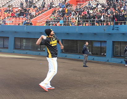 アイビースタジアムで、練習開始前に、直筆サイン入りボールを選手がスタンドに投げ込みます。ホークスの春季キャンプでは、大人気イベントの一つです。