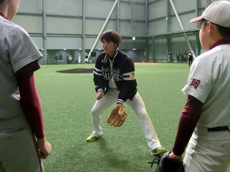 この日、講師を務めたのは若鷹寮でプロ生活を送る9人の選手。古谷優人投手、野澤佑斗投手、渡辺健史投手、樋越優一選手、森山孔介選手、松本龍憲選手、幸山一大選手、田城飛翔選手、清水陸哉選手が集まった40名の小学校6年生の子どもたちに丁寧に野球指導をしながら、楽しいトークなどでふれあいの時間を楽しみました。