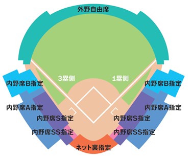 | 内野席B指定【1・3塁】 | 2,500円 | 3,000円 | 3,500円 | |