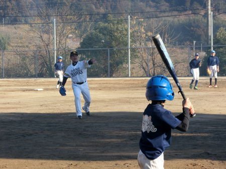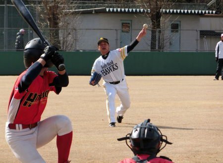 同小グラウンドでは杷木ファイターズ(杷木ジュニアホークススポーツ少年団と志波ベイスターズスポーツ少年団が今年1月に合併)の小学生男女23名を指導しました。指導内容は中学生とほぼ同じ。というより、ホークスの選手たちに対して工藤監督がいつも話している内容です。「投げ方や体の動きは子どもも大人も変わらないでしょう。小学生の時に変な投げ方をしていたのが、プロになって良くなるか…そうはならない。正しい動きを身に着けておくことが大切なんです。筋力などはそれからでもいい」と指導の意図について工藤監督は子どもたちに語りかけていました。そして、こちらのグラウンドでも子どもたちとの1打席真剣勝負。「速い球をお願いします」とのリクエストが多く、工藤監督は息を切らしながら左腕を何度も振り抜いていました。