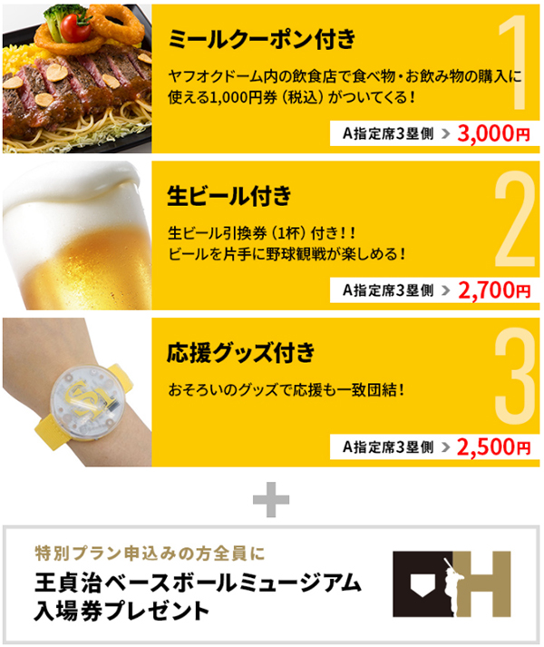 A指定席3塁側(通常価格¥3,000)が¥1,000でお求めいただける大変お得な内容となっております。