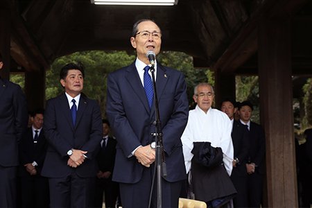 参拝を終えた王会長は3800名も集まってくださったファンの皆様に向けて「今日が我々の元旦でございます。これだけ多くの皆様にお集まりいただき嬉しく思います。昨年はホークスの歴史にも残るような戦いが出来ました。今年もまた新たなシーズンが始まります。大きな試練も待ち構えていると思いますが、心を一つに、最後の最後まで戦い抜きます。応援よろしくお願いします」と挨拶をしました。