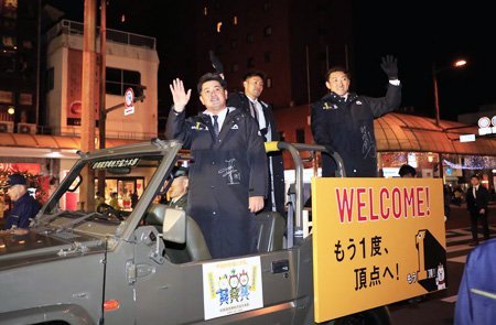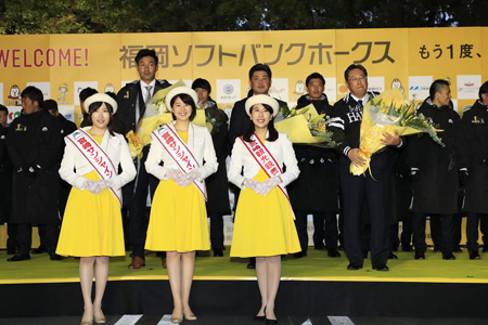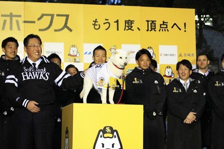 また、パレードに先立って行われた歓迎セレモニーにはソフトバンクCMでお馴染みの「白戸家のお父さん」も応援に駆け付け、さらに宮崎市の戸敷正市長よりアイビースタジアムに掲げられる昨年の優勝記念プレートと「完熟きんかん(たまたまエクセレント)1箱」が贈呈されました。宮崎県の河野俊嗣知事からは、宮崎牛20kg、みやざきブランドポーク30kg、みやざき地頭鶏10kgが激励品としてチームに贈られました。