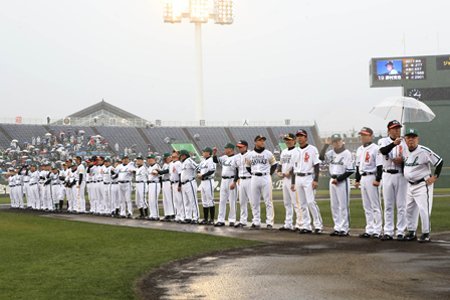 それぞれの世代で球界を沸かせた3種のユニフォームに身を包んだ往年の名鷹戦士たち。再会を懐かしむ声があちこちから聞かれ、ロッカールームはまるで大同窓会。ちなみに工藤公康監督は「福岡ダイエー」の背番号47のユニフォームに袖を通し、「僕にとっても特別なもの。1999年のあの(福岡移転後)初優勝が今の常勝ホークスのきっかけを作った」としみじみ。当時キャプテンだった秋山幸二氏(前ソフトバンクホークス監督)も「またこの『FDH』のユニフォームを着ることになるとは思わなかった」と感慨深げ。「ソフトバンク」ユニフォームで出場した小久保裕紀氏は「普段からしっかり走っている」、松中信彦氏は「引退からまだ2年。やりますよ」と今回のメンバーの中では“若鷹”の2人はやる気満々。秋山氏、小久保氏、松中氏がこの日のクリーンナップトリオでスタメン出場しました。