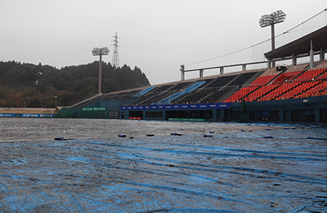 昨日の夜はグラウンドに全面シートははられていなかったのですが、朝はしっかりはられていました。「朝は雨降ってなかったけど、(グラウンド)キーパーさんたちが空の様子を見てシートはりたいって言ってたから、信用してシートはったけどほんと良かった!」という、キーパーさんの長年の勘でこうなったそうです。さすがです~!
