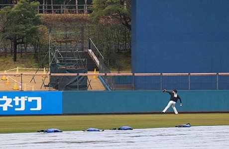 そんな中、雨が降るグラウンドでは武田投手がキャッチボールを行っていました。自分の中でいろいろ考えつつ、このキャンプを過ごしているようですね。キャンプについて、公式サイトの選手メッセージでしっかり話をきいてみたいと思います。