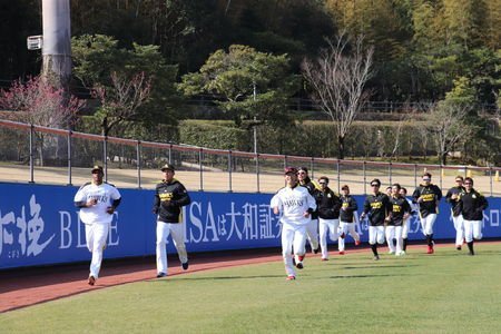 アップが終わると、野手はメイン球場でランニングメニューを行っていました。数本走って、もうそろそろ終わりかな?という時に、本多選手が「晃のせいや~!!笑」と言いながら走っていました。