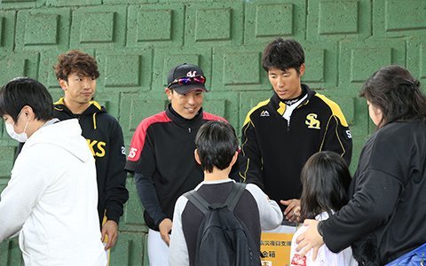 当日は同球場で千葉ロッテマリーンズとのオープン戦。その試合前にホークスとマリーンズ両チームの監督、選手がともにファンの皆さんの前に登場しました。参加したのはホークスから工藤公康監督、柳田悠岐選手会長、中村晃選手、本多雄一選手、西田哲朗選手、上林誠知選手。マリーンズからは井口資仁監督、大隣憲司投手、涌井秀章投手が駆けつけました。