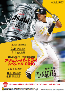 アサヒビール九州統括本部では、「アサヒスーパードライスペシャル2018」のPRに、福岡ソフトバンクホークス所属の柳田悠岐選手を起用します。柳田選手は、アサヒビールが協賛する公式戦「アサヒスーパードライスペシャル2018」当日のポスター、動画での広告やスクラッチチャレンジ(※後述)告知広告など各種プロモーションで登場します。