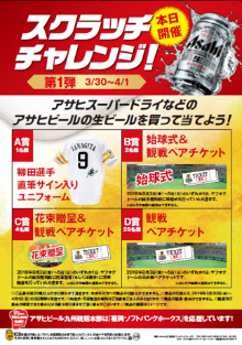 売店および売り子販売にてアサヒビール商品を購入していただいたお客様にスクラッチチャレンジ券を進呈。 当選者に、柳田選手のサイン入りグッズや観戦チケット(開幕シリーズは、始球式権利+観戦チケット、花束贈呈権利+観戦チケット)などがあたるキャンペーンを実施。