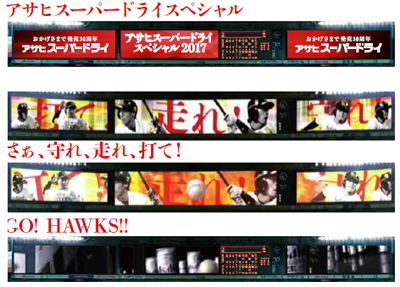 試合開始冒頭やホークスに得点が入るとバックスクリーンビジョンに、アサヒスーパードライオリジナル動画が流れます。また5回イニング間などには、ホークス応援メッセージの動画が流れます。