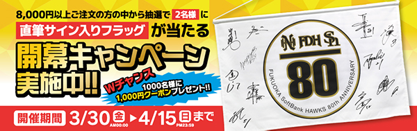 ホークス公式通販ショップ ダグアウトにて、8,000円以上ご注文の方の中から抽選で2名様に、工藤監督と2018年開幕スタメン選手10名の直筆サイン入り80周年フラッグをプレゼントします。さらに、Wチャンスで1,000名様には、1,000円分のクーポンもプレゼント!
