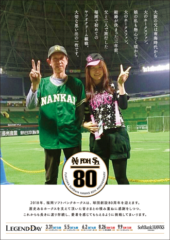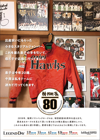 球団創設80周年を記念し、ファンの皆様から「私とホークス」をテーマに思い出の写真とエピソードを募集し、80作品をポスター化する「サンクス!メッセージリレー」のポスター掲出が開始!第1弾として7作品が、ヤフオクドーム4ゲート前や80周年特設サイトなどで登場します。募集は7/31(火)まで受け付けていますので、奮ってご応募ください。